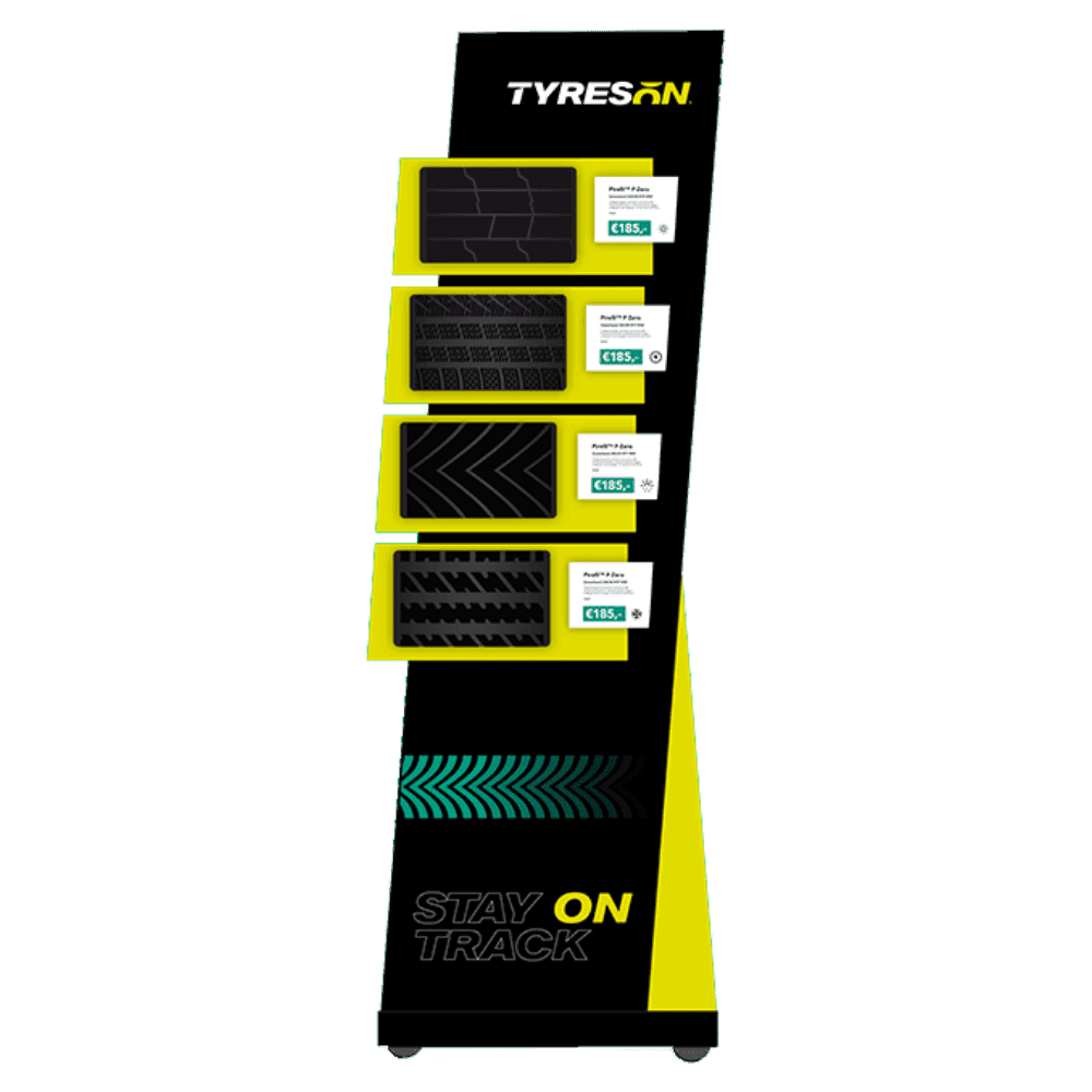 Pas de présentoir statique de pneus, mais un présentoir unique de pneus "Tyres-On" dans votre garage ! Ce concept a été développé pour sensibiliser vos clients aux différents types de pneus. Le présentoir contient de vrais morceaux de pneus de nos marques préférées, afin que votre client puisse sentir lui-même les différences entre les types de pneus. Les pièces de pneus et les cartes d'information peuvent être changées à tout moment. En tant que participant à Tyres-On, vous recevrez ce présentoir dans le cadre du pack de démarrage Tyres-On.